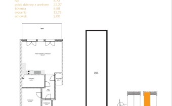 mieszkanie składa się z przestronnego salonu z aneksem kuchennym (33m2), sypialni, wiatrołapu, hallu, pomieszczenia gospodarczego - spiżarki, oraz łazienki. Istnieje na życzenie klienta, możliwość wydzielenia z salonu pokoju o powierzchni ok. 11m2.