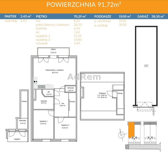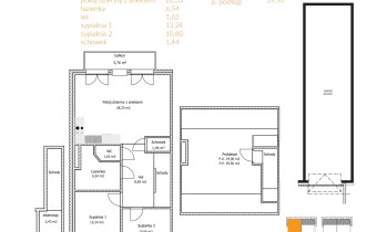 mieszkania położone na piętrze budynku o powierzchni OK. 89,5 m2 składa się z przestronnego salonu z aneksem kuchennym (28,3m2), dwóch sypialni (10,5m2 i 13,2m2), wiatrołapu, hallu, pomieszczenia gospodarczego - spiżarki, łazienki (6,5m2), osobnej toalety oraz dużego pokoju na poddaszu o powierzchni użytkowej 19 m2 do adaptacji np. na sypialnię z łazienką i garderobą,