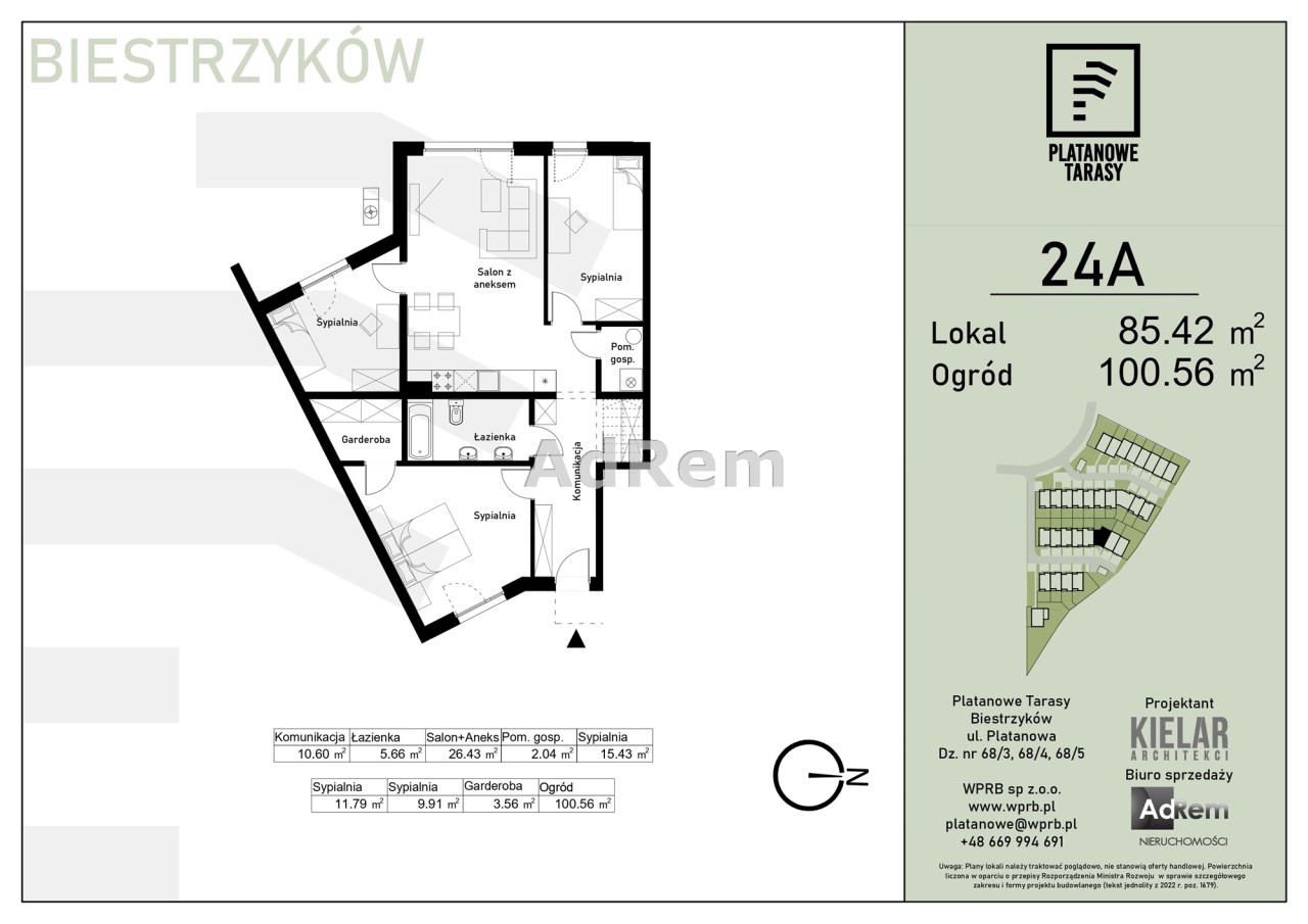 Metraże mieszkań - od 66mkw do 129mkw. Ilość pokoi w mieszkaniach - od 3 do 5 Powierzchnie ogrodów przyległych do mieszkań - od 43mkw do 535mkw, Powierzchnie tarasów w mieszkaniach ( pierwsza i druga kondygnacja ) 12,5mkw do 44mkw.
