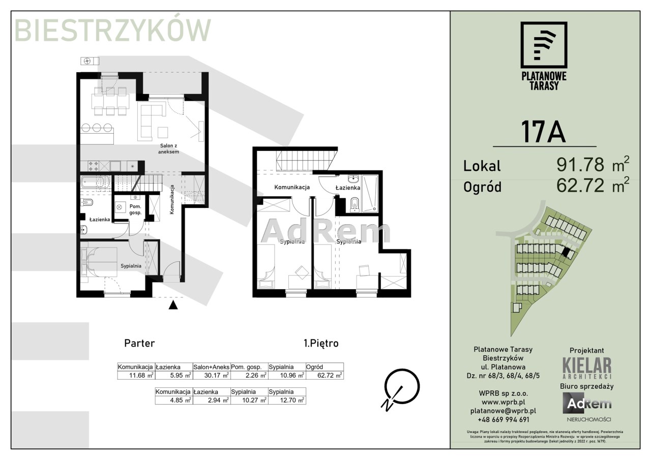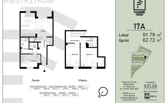 Metraże mieszkań - od 66mkw do 129mkw. Ilość pokoi w mieszkaniach - od 3 do 5 Powierzchnie ogrodów przyległych do mieszkań - od 43mkw do 535mkw, Powierzchnie tarasów w mieszkaniach ( pierwsza i druga kondygnacja ) 12,5mkw do 44mkw.