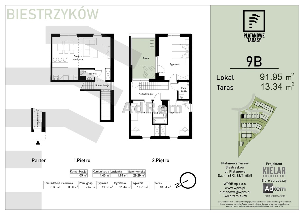 Prezentowane mieszkanie o pow. 91,95 mkw, jest dwukondygnacyjne, składa sie z czterech pokoi ( trzy sypialnie) w tym dużego salonu z aneksem kuchennym, łazienki, toalety oraz tarasu o pow. ok. 13.34mkw.