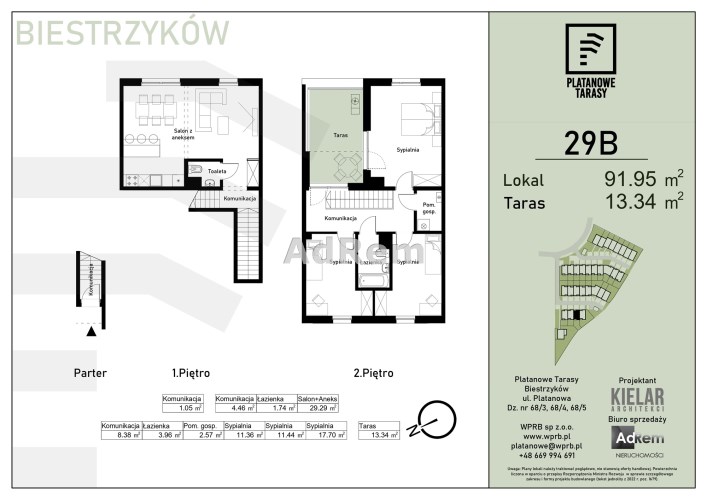 Prezentowane mieszkanie o pow. 91,95 mkw, jest dwukondygnacyjne, składa sie z czterech pokoi ( trzy sypialnie) w tym dużego salonu z aneksem kuchennym, łazienki, toalety oraz tarasu o pow. ok. 13,34mkw.