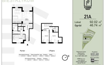 Prezentowane mieszkanie o pow. 92,02 mkw, jest dwukondygnacyjne ( parter i piętro ) , składa sie z czterech pokoi ( trzy sypialnie) w tym dużego salonu z aneksem kuchennym, dwóch łazienek oraz ogrodu o pow. ok. 46,74 mkw.