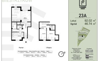 Prezentowane mieszkanie o pow. 92,02 mkw, jest dwukondygnacyjne ( parter i piętro ) ,  składa sie z czterech pokoi ( trzy sypialnie) w tym dużego salonu z aneksem kuchennym, dwóch łazienek oraz ogrodu o pow. ok. 46,74 mkw.