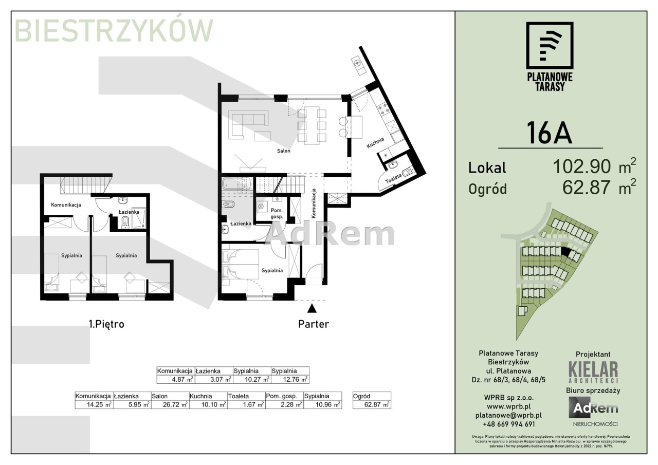 Metraże mieszkań - od 66mkw do 129mkw. Ilość pokoi w mieszkaniach - od 3 do 5 Powierzchnie ogrodów przyległych do mieszkań - od 43mkw do 535mkw, Powierzchnie tarasów w mieszkaniach ( pierwsza i druga kondygnacja ) 12,5mkw do 44mkw.