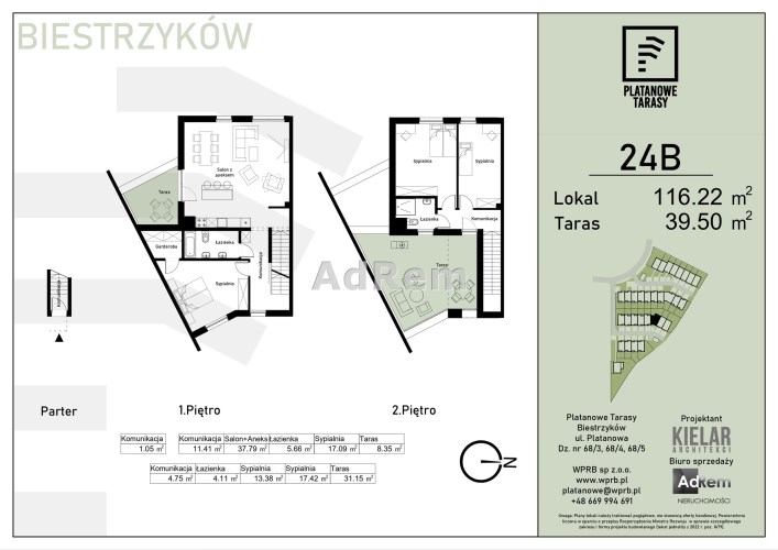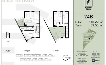 Prezentowane mieszkanie o pow. 116,22 mkw, jest dwukondygnacyjne, składa sie z czterech pokoi ( trzy sypialnie) w tym dużego salonu z aneksem kuchennym, dwóch łazienek, garderoby oraz dwóch tarasów łącznej pow. ok. 39,50mkw.